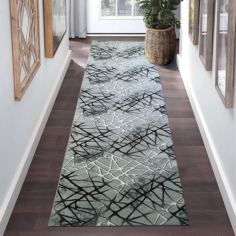 Covor Antiderapant Abstract, Nuanțe Gri – covor subțire cu grosimea de aproximativ 8 mm. Pe verso suportul acestuia este prevazut cu cauciuc, sub formă de granule, acestea oferind o mai buna aderență pe suprafețe gen: parchet laminat, gresie, mozaic, etc. Este ușor de întreținut: măturat, aspirat sau spălat, cu textura fină, moale și plăcut la atingere. Se adaptează pentru orice tip de încăpere: camere de zi, dormitoare, bucătarii, holuri, balcoane închise, etc.