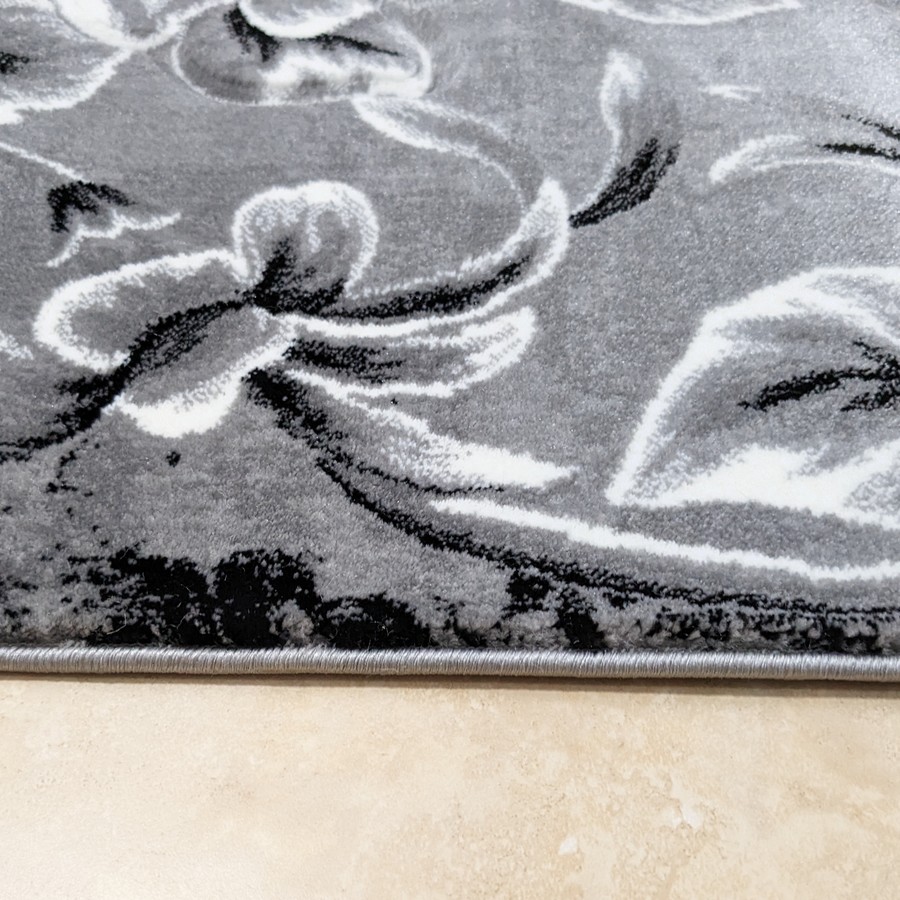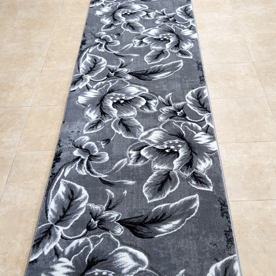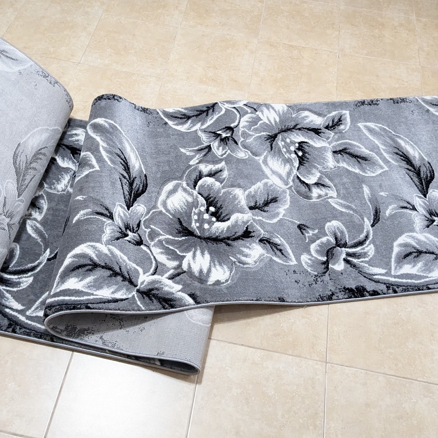 Traversa Imperial Gri cu Motiv Floral – covor țesut cu fire scurte, înălțimea acestora este de aproximativ 20 mm. Moale și plăcut la atingere, cu forme ieșite în relief, ușor de întreținut – măturat, aspirat, sau cu aparate de curățat umede. Culori de baza: gri cu negru, cu motiv floral.